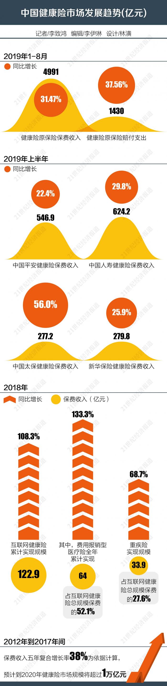 的确,健康险增长趋势强劲。中国银保监会最新发布的数据显示,今年1-8月,健康险原保险保费收入4991亿元,同比增长31.47%;健康险原保险赔付支出1430亿元,同比增长37.56%。