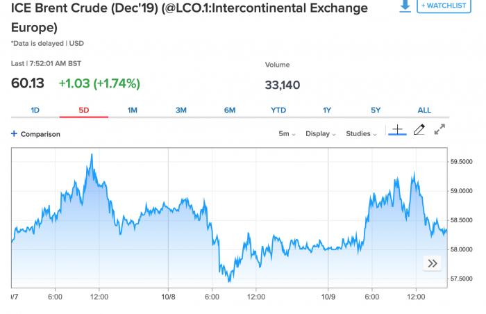 10月11日亚洲交易时间,国际油价拉升,布伦特原油和WTI原油期货双双上涨2%左右,截至发稿,布油期货上涨2.2%报60.43美元/桶,WTI期货上涨2.04%报54.65美元/桶。受该国际消息影响,国内市场石油能源相关板块短时也出现上涨。
