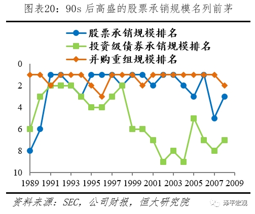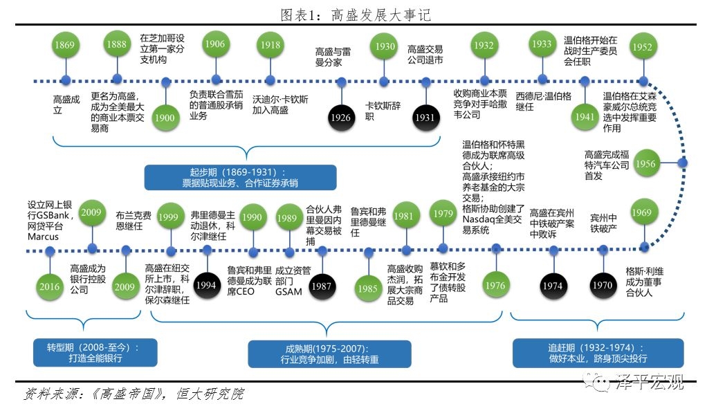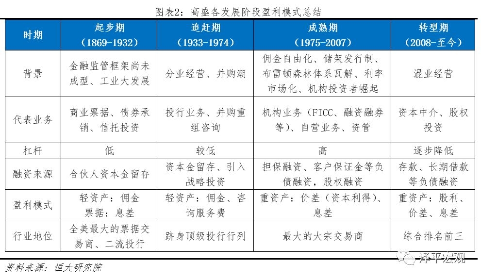 1)起步期(1869-1931年):票据起家,折戟资管票据业务起家:1869年,德裔犹太人马库斯·戈德曼举家迁到纽约,以票据贴现业务起家,成为放贷中介。1888年公司更名为高盛(Goldman,Saches & Co.)。美国南北战争后银行信贷利率维持在一个很高的水平上,给高盛发展票据贴现业务创造了盈利空间,19世纪90年代,高盛已经成为全美最大的商业本票交易商,营业收入也由1882年的5万美元倍增至1890年的3100万美元,1894年达到6700万美元。投行业务破冰:19世纪最后20年,美国完成了规模宏大的工业化进程,修建铁路等重工业建设进入尾期,时值制造业起飞前夜,高盛与雷曼兄弟合作包销证券,完成了沃辛顿泵业公司的债券承销、西尔斯在欧洲的股票发行等业务,成为真正意义上的投资银行。高盛深谙制造业相对重工业的商业模式差异,开创“以公司未来的盈利能力而非当前的固定资产总值作为衡量公司股票发行价值”的定价方式,开辟新市场。信托计划折戟:在第三代领导人沃迪尔·卡钦斯的带领下,高盛试水投资信托业务,成立高盛交易公司,通过层层控股加杠杆,以不到2500万美元的总资本掌控5亿美元的投资。但在大萧条中遭受重创,1931年高盛巨亏1.2亿元,占合伙人原始投资的92%;当年华尔街排名前14位的信托公司累计亏损1.725亿美元,高盛交易公司一家占其中的70%,濒临倒闭,被阿特拉斯公司低价收购,此后40年间高盛均未涉足资管业务。2)追赶期(1932-1974年):重振投行业务,跻身顶尖行列温伯格临危受命,重塑高盛声誉。西德尼·温伯格是高盛的传奇领军人,他13岁辍学,16岁时以清洁工的身份加入高盛,但拥有高超的沟通才能和学习能力,1927年成为合伙人,1930年临危受命,此时深陷投资失败泥潭的高盛,声誉败坏,5年内没有一笔承销业务,1929年到二战结束的16年间只有一半年份盈利。借力从政经验拓展人脉,重振投行业务:1932年罗斯福首次竞选总统时,因抨击总统与华尔街暧昧关系而受排挤。温伯格成功押注罗斯福并提供竞选资金,后被委以重任,牵头成立商务顾问及策划委员会,1941年应邀任职战时生产委员会主席助理,为总统物色选拔商业人才,由此结识众多社会精英,例如福特二世,为高盛带来资源和机会。持续付出,开拓客户。温伯格鼓励公司以免费方式开发新客户,重塑高盛的品行和价值,他亲自为福特提供长达9年的免费服务,终于在1956年拿到福特汽车IPO订单业务,创造了当时最大的融资计划,高盛由此跻身顶级投行榜单。打造防御收购的品牌:20世纪60-70年代,时值美国混合并购浪潮,高盛建立了华尔街第一个兼并收购部,率先打出“防御收购”的旗帜,树立了“与中小企业站在一起”的正面形象,获得大量业务,至今并购咨询仍是高盛的“王牌”业务。3)成熟期(1975-2007年):行业竞争加剧,向重资产业务转型美国资本市场四大变革带来业务机会。1)固定佣金制改革。1975年美国国会通过《证券法修正案》,废除长达185年的证券交易固定佣金传统,实施佣金协商制,佣金费率由1975年的0.5%大幅下滑至2001年的0.06%,传统经纪业务收入占比由1975年的46%降至2007年的12%。2)储架发行推出。1983年SEC正式采纳“415条规则”,储架注册制推出。这两项变革加剧了投行在传统领域的竞争,大投行开始向重资产业务转型。3)衍生品需求爆发。1971年布雷顿森林体系瓦解,各国采用浮动汇率制,开始利率市场化,汇率、利率波动增加,催生金融衍生品服务需求。4)机构投资者崛起。1981年401K计划开始推出,共同基金和养老基金等大型机构入市,大宗交易在总交易量中的占比由1971年的17.8%增至1989年的51.1%。