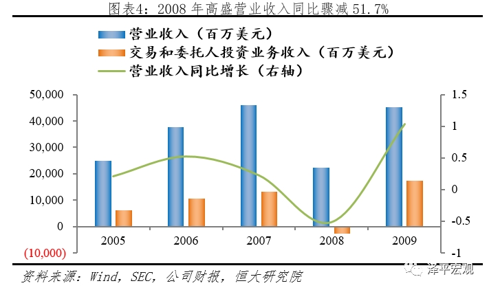 次贷危机中遭受亏损,获批成为银行控股公司:2008年高盛营业收入同比骤减51.7%。当年第四季度,高盛筹集207.5亿美元股权融资,其中50亿来自巴菲特;并向美国政府申请了242亿美元的紧急救助贷款;此外,高盛获批成为银行控股公司,在《巴塞尔协议Ⅲ》的要求下根据银行资本充足度的监管规则下去杠杆,并依照《多德-弗兰克法案》、《沃克尔规则》重组业务条线,剥离部分风险较大的自营业务,增加场外衍生品的透明度。