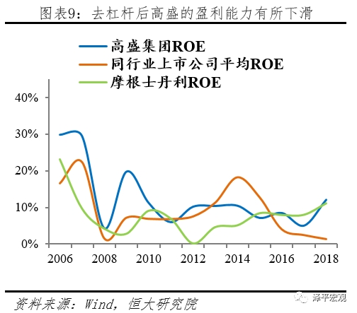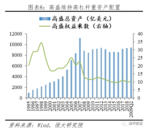 2 经营绩效及业务布局现状2.1 总量层面:高杠杆经营,交易收入占比扩大总体维持高杠杆重资产配置,2008年后去杠杆。截至2019年上半年,高盛总资产为9449亿美元,杠杆降至10.2倍。2009年前,高盛年平均资产增速达到19.5%,权益乘数平均高达22.3倍,2009年高盛获批成为银行控股公司,逐步降低杠杆,资产规模稳定在9000亿美元左右,平均权益乘数降至11倍。去杠杆使得ROE出现一定下滑。2010年以前平均ROE达到19%,远超同业上市公司平均的10.3%,在金融危机期间虽有大幅下跌,但仍然跑赢同业;2010年业务重心转移后,高杠杆的自营和做市业务缩减,公司的盈利能力有所下降,2011-2018年,高盛的平均ROE降为9.04%,略超行业平均7.94%,2015年甚至低于行业平均。