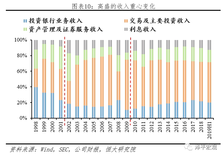 收入贡献主力从轻资产业务转移至重资产业务。1999年改组上市后,高盛的业务架构经过两次调整:1)1997-2001年,轻资产业务贡献了大部分营收,投行和资管业务收入平均占比分别为33%和23%;重资产的交易业务收入占比35%。2)2002-2009年,为顺应衍生品业务加强的趋势,高盛将交易与自营业务独立出来,MBS、货币市场工具、方向性投资等资本交易业务不断涌现,交易及投资收入占比大幅上升至54%,其中做市业务贡献最大,收入占比由上阶段的9.3%上升至14.2%;投行和资管业务收入平均占比下降至16.1%、15.6%。3)2009年金融危机后,高盛将投资与信贷部门独立,出清部分高风险的自营投资,2019H1总营收达到183亿美元,其中利息收入占比降至11.5%,交易业务的比重维持在50%附近,资管收入比重微升至16.1%,投行业务占比也有所回升至18.4%。