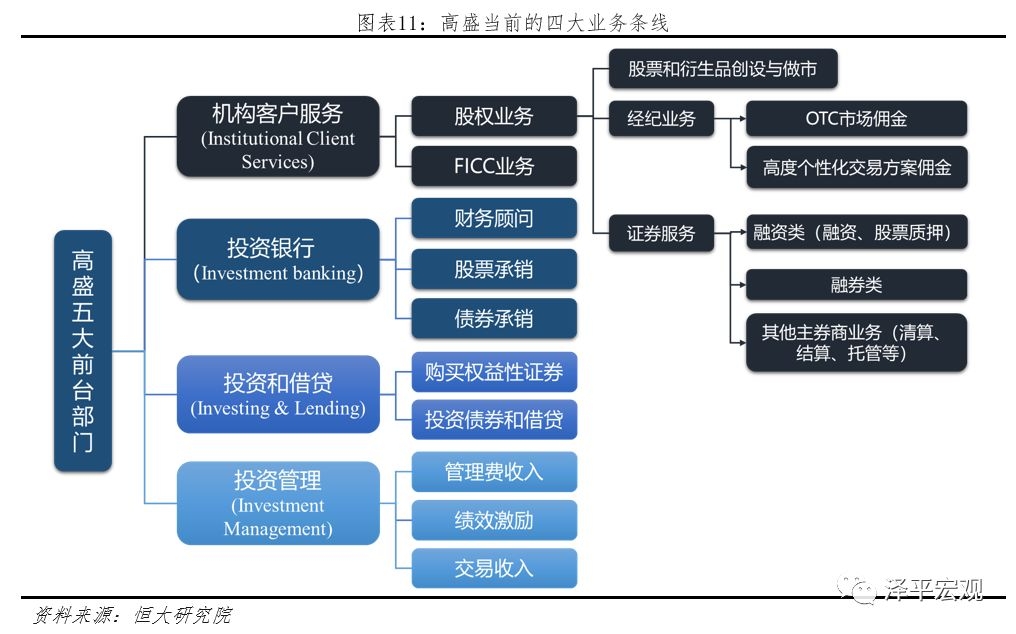 2.2 分部层面:当前高盛形成四大业务条线当前高盛按照客户类别划分出四大业务条线,机构客户服务业务部门和投资与借贷部门属于重资产业务,盈利由杠杆驱动;投资银行部门和投资管理部门属于轻资产业务,盈利由ROA驱动。
