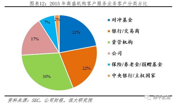 机构客户服务业务是高盛特色最鲜明的板块,也是贡献收入最多的部门,2018年该部门收入134.8亿美元,占比37%。重点服务于买方机构客户,资管机构占比最高约为30%。2008-2018年,机构客户服务板块以平均82%的资产贡献了54%的收入和85%的利润,平均ROA仅为0.82%。利息、价差等是主要的收入形式,也有少量交易费用和管理费。利源核心在于资产负债表扩张,提升资产利用率、提高加杠杆能力成为盈利关键。
