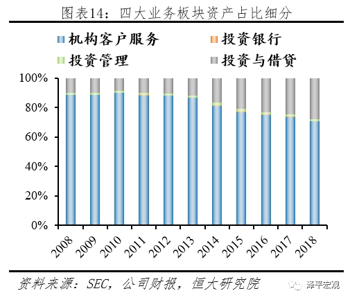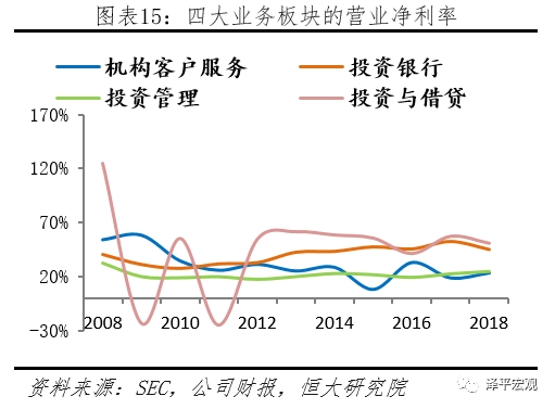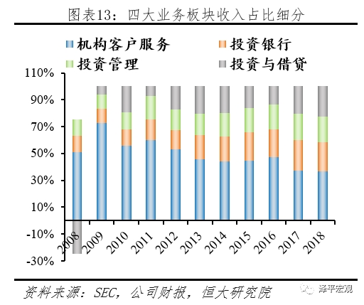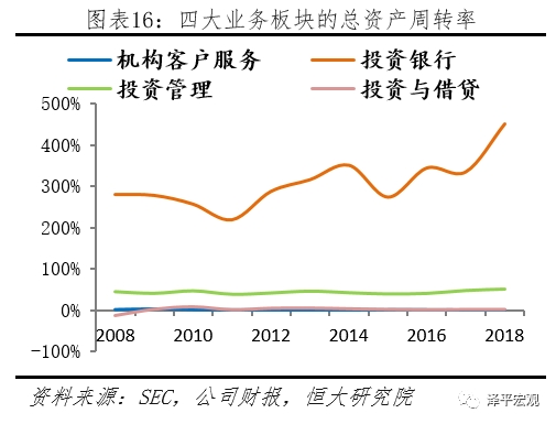 投资和借贷业务:高盛的投资与借贷板块涵盖了自营及贷款业务。具体包括:通过投资贷款向客户提供长期融资,通过管理的基金直接或间接投资债券、上市公司、房地产等。投资收益和利差等为主要的收入形式,属于重资产业务,驱动引擎主要是投行主动负债加杠杆的能力。2008-2018年,投资与借贷板块平均资产占比16%,由2010年的8.6%后逐步上升至2018年的27.8%,贡献收入占比10.4%,贡献利润不稳定,市场风险较大,2008年金融危机中巨亏135.4亿美元。投资管理业务:主要通过独立管理账户如共同基金和私募基金等,向机构或高净值客户提供理财服务,包括投资组合管理和财务顾问等业务。该部门的收入形式表现为管理费、业绩提成和交易费三种,属于轻资产业务,驱动力来自于投行的主动管理能力及业务销售能力。2008-2018年,投资管理板块以平均1.5%的资产贡献了17.2%的营业收入和16.4%的税前净利润,平均资产周转率为43%。