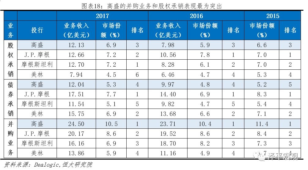高盛轻资产业务中,并购咨询表现最为突出。2001-2018年,投行业务板块中,股权承销、债券承销、并购咨询收入平均占比分别24%、30%、46%。1)财务顾问业务是高盛的传统优势项目,根据Dealogic提供的2017年全球投行收入排名中,高盛的并购咨询收入高达24.5亿美元,市场份额10.5%,高居榜首。2)高盛的股票承销业务规模20世纪90年代基本稳居行业前三。2017年收入为12.1亿美元,占市场份额6.9%,排名第三;3)债券承销上,2000年后债券业务风险较高,高盛逐渐压缩规模,裁撤部门,债券承销规模从1999年后开始有所下滑,集中在7-9名之间。2017年债券承销收入12亿美元,市场份额5.3%,排名第四。