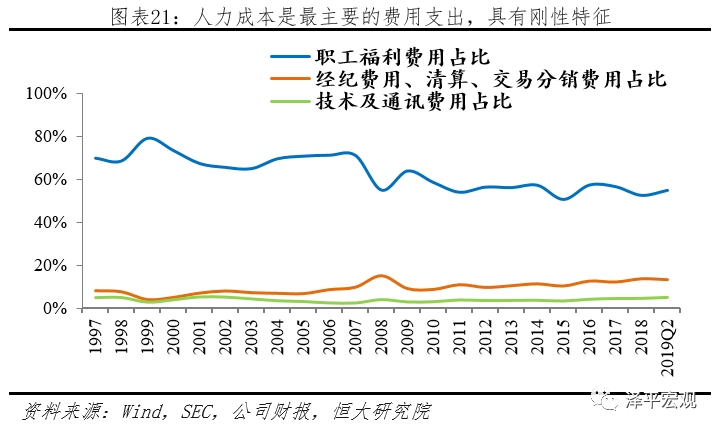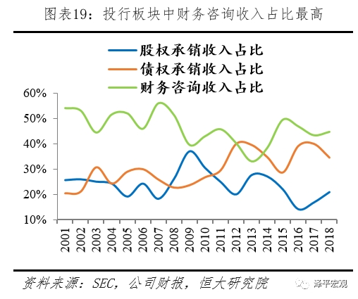 美国1975年推动佣金自由化改革,后推行储架发行制,价格竞争加剧,证券业盈利模式重塑,大型投行转向机构交易,主动加杠杆涉入重资产业务,精品投行专攻几项优势项目,提供差异化服务。我国在2015年才正式开启佣金市场化改革,证券业经纪、承销等轻资产收入从2008年的76.7%降至2018年的33.1%。2019年9月证监会召开座谈会提出“允许优质券商拓展柜台业务,丰富期货期权产品”、“加快建设高质量投资银行,支持优质券商创新提质,鼓励中小券商特色化精品化发展”等深化资本市场改革的重点方向,未来鼓励证券业发展的、合理放开行业约束的政策红利可期。