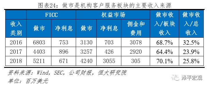 资本交易业务是指投行为股债交易提供一揽子交易服务,包括利率汇率衍生品创设、做市、自营、账户管理等,赚取证券价差和管理费,平均营收贡献比重高达57%。分为FICC和权益,分别服务非股权和股权类交易。2018年FICC做市业务净收入52.1亿美元,净利息收入6.7亿美元;权益市场做市净收入42.4亿美元,净利息收入30.6亿美元,佣金和费用收入3.1亿美元。