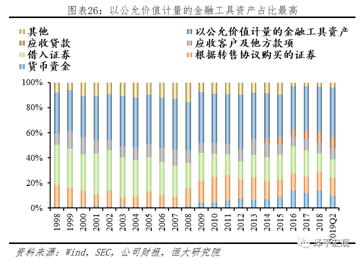 做市形成的证券持仓在高盛的报表中主要体现于“以公允价值计量的金融工具资产”科目,与国内券商主要从自营形成的该项资产内涵上有本质区别。1998-2019年上半年,该项资产在高盛的总资产中占比最大,平均达到37.3%。2013年用以满足做市交易的金融资产公允价值达到2736亿美元,在该科目中占比75%,自营形成的金融资产占比14%;另外,转售协议、融入证券等科目中也有少量由做市业务形成的金融资产,合计3805亿美元,占总资产的41.2%。