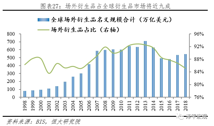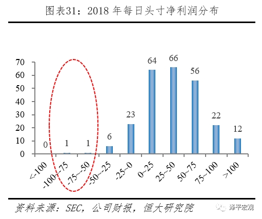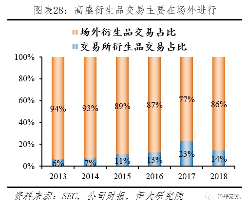 3.2.2 驱动引擎:衍生品创设和风控能力在资本交易业务中,投行承担风险中介的职能,承担流动性、市场和信用风险,高盛赢在创设风险产品以及做好风险管理。一是场外市场创设衍生品,提供流动性,收取保证金。从市场来看,高盛衍生品交易主要是在场外市场进行。全球场外衍生品市场规模高达500万亿美元,给重资产的高盛带来发展空间。以名义值计算,2013-2018年,高盛场外衍生品交易平均占比88%,是场内7倍。凭借场外衍生品交易,高盛可以收取高额保证金,但也出现多起金融衍生品欺诈案。