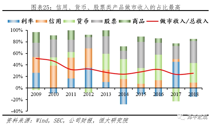 根据产品种类来看,场内市场在交易所内进行,标准化、流动性高,投行发挥通道职能居多;场外市场是报价驱动市场,流动性较差、多为非标准化证券,买卖双方报价时间不对称致使其不能总是找到合适的交易对手,做市商的职责就是将自己作为对家与客户进行交易,以自有资本持仓为交易对手方提供流动性,可以获得价差、利息和佣金收入,高盛做市在资本交易中占比高达70%,其中又以信用、货币、股票类产品做市为主,2009-2019年,平均收入占比分别为26%、22%和35%。利率产品做市收入波动性较大。