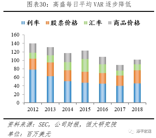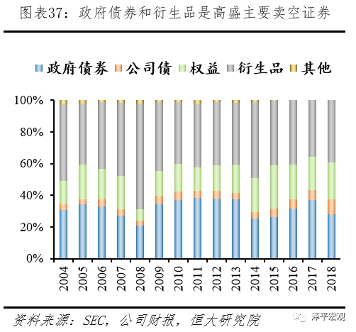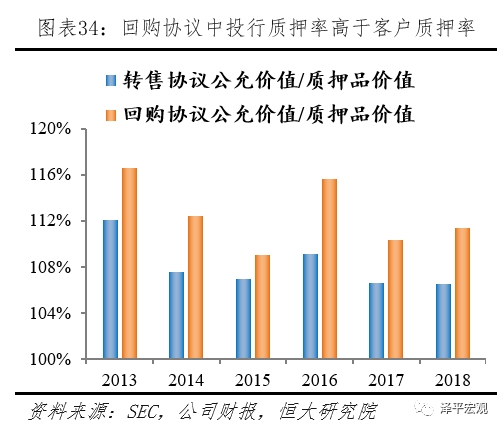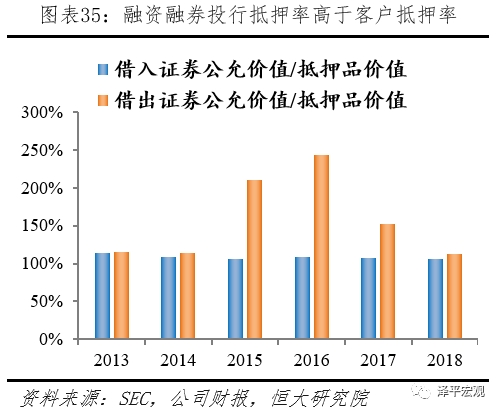 2)融资融券:与回购协议的类似,融资融券中投行通过客户抵押品向其融出资金或证券,区别在于一是融资融券业务以资金或证券为标的,投行可以借出证券,到期收回证券和利息;二是回购协议中证券的所有权转移作为质押物,而融资融券业务中证券所有权未转移,仅做抵押用。融资融券业务中客户抵押率也低于投行抵押率,2018年,客户以12.7亿美元的抵押品获取了13.5亿美元的融资,抵押率为106.2%,高盛以10.5亿美元的抵押品获得了11.8亿美元的负债融资,抵押率为112.6%。