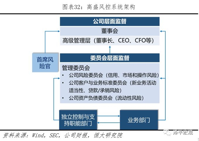 2)风险管理治理结构三道防线:高盛自上而下形成了金字塔式的风险管理治理结构,董事会直接或通过风险委员会监督风控政策和实践,进行年度审查以及批准风险偏好声明,首席风险官向董事会报告。管理委员会下设三类具体风险管理委员会,根据交易及风险特征采用多种分析及报告系统:公司风险管理委员会负债持续监控全球业务和产品的信用、市场和操作风险;客户及业务标准委员会负责评估并确定客户关系、客户服务及公司声誉等方面;公司资产负债委员会负责流动性风险管控,总体上形成运营和技术、独立风险监督和控制和内审三道风控防线。