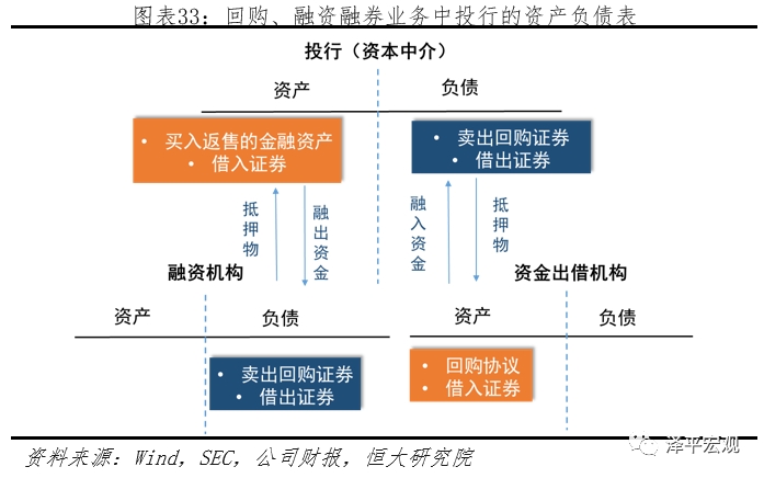3.3 资本中介业务:创造信用、提升杠杆3.3.1 盈利模式:投行承担信用中介的职能赚取息差收益资本中介业务指投行作为金融中介,从事与商业银行类似的信贷业务。投行在资本中介业务中承担影子银行的信用创造职能,以赚取息差为盈利形式,投行通过客户抵押物的再抵押创造信用,提升杠杆。具有资本中介功能的业务包括融资融券、回购协议、股票质押等。1)回购协议:投行以较低的质押率向客户融出资金,再利用自身信用优势以较高的质押率融入资金。在资产端,投行向客户融出资金,购入证券作为抵押物,在负债端,投行出售客户抵押物进行再抵押获得融资,抵押品多次使用放大经营杠杆;回购价与卖出价之间的差价为融资成本,由回购利率决定。