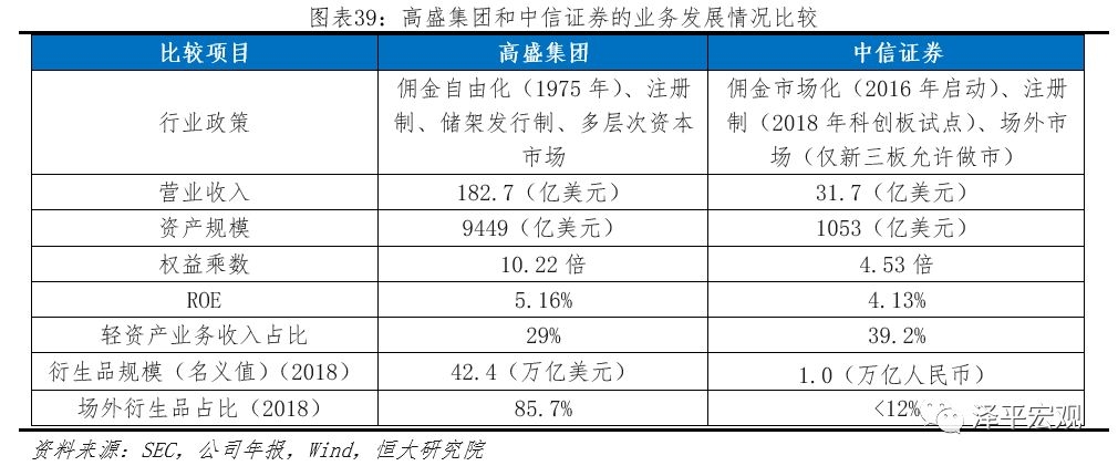 3 经营手法从商业模式来看,高盛有三类主要业态:一是以投行、经纪、资管等为代表的轻资产业务,以牌照、人才、先发优势为驱动,对资金需求不大,早期经营由合伙人资本投入、盈利留存以及战略投资者的投入可以维持运作,提高ROE的关键在于通过扩大业务规模提高销售净利率。二是以回购协议、融资融券、股票质押、贷款等业务为代表的资本中介业务,核心是融资加杠杆能力,属于重资产经营业态,投行承担信用中介职能,是获取流动性、加杠杆的重要来源;高盛多渠道融资以及优惠的融资成本创造了独特的优势。三是资本交易业务,以做市、自营、股权投资等重资产业务为主,核心是产品定价和风控能力,投行承担风险中介职能,以开发资产端的客户需求为拉动引擎,高盛以先进的衍生品定价能力和风控能力打造了维持先进的“护城河”。