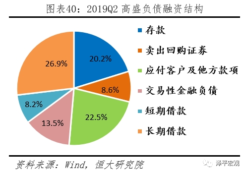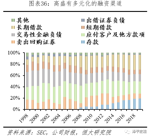 3)客户保证金抵押融资:指投行将客户提交的交易保证金作为抵押品进行负债融资。根据T规则(Regulation T)和SEC的15c3规则(Rule 15c3),美国投行可以使用客户的证券抵押物进行再抵押,通过重复抵押放大经营杠杆。3.3.2 驱动引擎:多元化融资渠道及低廉的融资成本高盛在资本中介业务中充当信用中介,以多元化融资渠道和低廉的成本为驱动。一是融资渠道多元。主动负债占比六成,逐渐减少。1998年-2019H1,高盛主动负债的平均占比为65%,从1998年的71.4%递减至2019H1的56.7%。其中,1)回购协议融资:2008年后,回购协议在高盛的负债融资结构中占比减少,从1999年的17%降到2018年的9%;2)借出证券:自1998年的5.3%递减至2019H1的1.6%;3)交易性金融负债:该项负债由证券卖空形成,2008年前在负债融资中占比较高,平均达到24.3%;金融危机后逐步下降,2019H1比重为13%。政府债券和衍生品是高盛主要的卖空对象,2004-2008年间,卖空政府债券和衍生品金融负债的平均占比分别为29.3%、48.5%,2009-2018年,卖空政府债券的金融负债平均占比上升至33.4%,卖空衍生品金融负债占比下降至40.5%。4)长短期无抵押债务融资:2019H1发行长期无担保债券占比25.9%,发行商业票据、承兑汇票等短期无担保债券占比7.9%。转型银行后,被动负债占比上升。被动负债包括存款和应付应付客户及他方款项,1998年-2019H1平均占比为35%,2009年转为银行控股公司后,存款负债成为高盛新的融资渠道,占比由2009年的5.1%迅速增长至2019H1的19.5%。此外,应付客户及其他方款项也是高盛重要的融资渠道,2019H1该项负债为1852.79亿美元,占总负债的比重为21.7%。