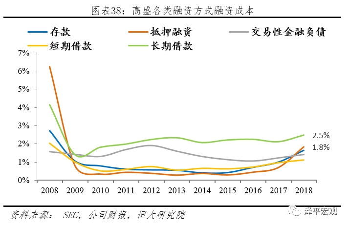 二是融资成本低至0.6%-2.5%。回购协议和融资融券业务同属于担保融资项目,即使用客户保证金作为抵押品进行负债融资。除2008年外,担保融资是高盛融资成本最低的负债,2009-2018年平均成本仅为0.6%。同期银行存款、交易性金融负债、短期借款、长期借款的平均负债成本分别为0.8%、1.4%、0.8%、2.1%。从时间趋势上来观察,除2008年金融危机期间流动性短缺造成融资成本高企之外,其余年份高盛的融资成本均十分低廉且较为稳定。