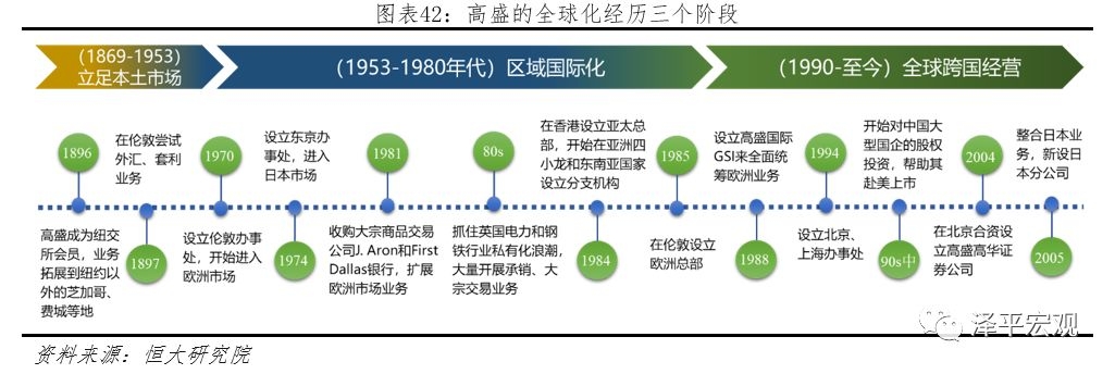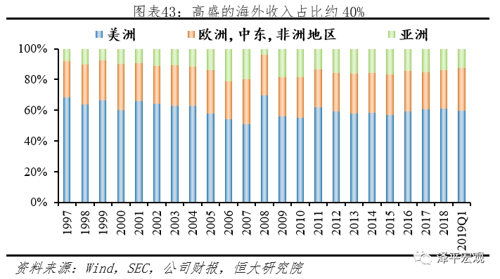 高盛在国际化浪潮中确立世界顶级投行地位。高盛国际化进程开始于20世纪50年代,1953-1980年进军欧洲和日本市场,1990年后从发达市场转向新兴市场,1994年,高盛在北京和上海设立办事处;2001年,高盛首次在题为“构建更好的全球经济”的研究报告中提出“金砖四国(BRICs)”的说法。截至2019年第一季度,高盛来自欧洲、中东、非洲地区的收入占比达到27.9%,来自亚洲的收入占比12.5%,海外收入总额约占四成。