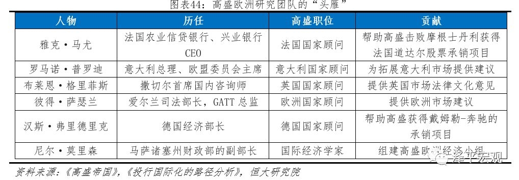 1)市场开拓方面,聘请国际顾问,组建高素质的研究团队。“区位条件、文化同源性将最终影响投行国际化战略实施的效果。”为了尽快融入当地文化、了解市场营商环境和政治生态,高盛在各地聘请了政府部门离职的高官,或与政府及大型公司有密切关系的专家作为顾问,打造高素质的研究团队。