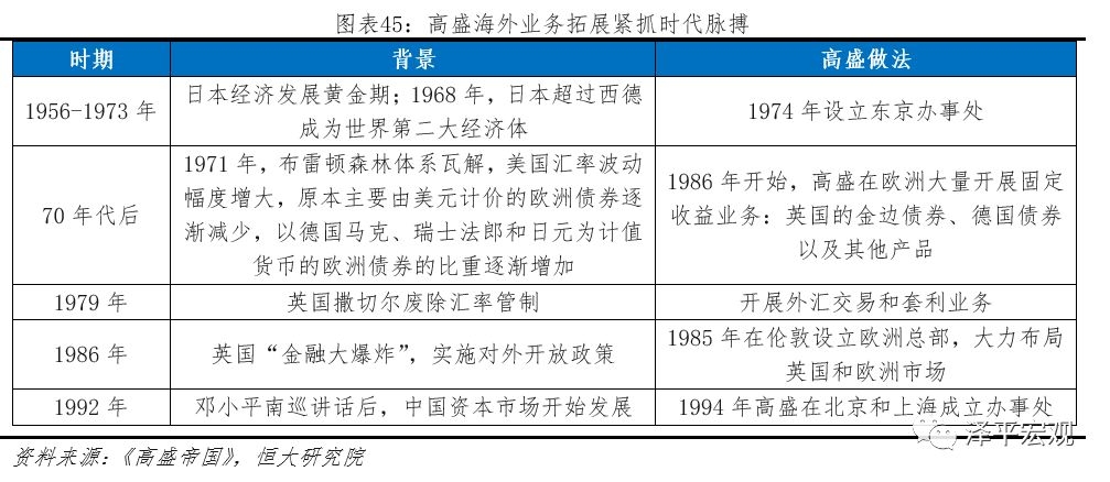 2)业务选择方面,循序渐进,从自身优势业务输出逐渐过渡到产业价值链中高端环节的业务。高盛将商业票据业务作为打开国际市场的突破口,使得英国的大型企业能用比银行商业贷款低得多的利率提高营运资本;1979年后撒切尔废除外汇管制,外汇交易、套利业务等成为新的增长点,同时英国市场对美国股票,特别是科技股和医药股的需求开始井喷,高盛适时地将在本土市场运营成熟的大宗交易推向英国;80年代中期,金融自由化迅速推进,欧洲全能商业银行的竞争挤占投行的经营利润,高盛逐步将业务重心过渡到自营业务的开发上,大大提高了国际业务的盈利能力。