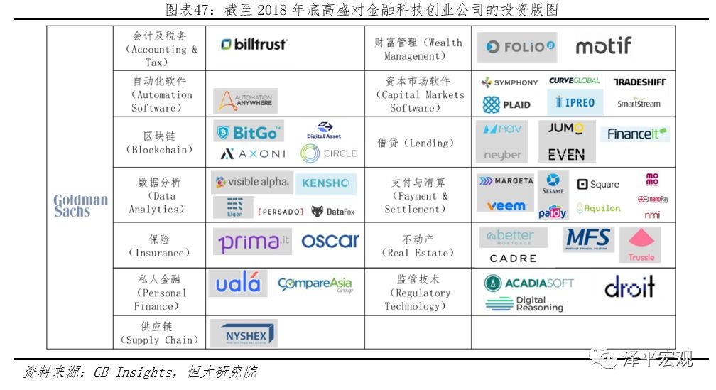 二是大量对金融科技前瞻性的研究投入,引导市场预期。高盛对人工智能和区块链等前沿科学进行了持续性的研究,并发布了一系列的深度报告;早在2015年初,高盛就已经开始将区块链研发成果申请专利,主要成果有两项,一项是用于处理外汇交易的一种分布式账本,另一项是一种加密货币SETLcoin。此外,高盛定期举办“高盛技术与互联网大会”,邀请GoogleCloud CEO、苹果CEO等国际科技巨头分享前沿研究成果。三是自营打造互联网金融机构:2015年,高盛打造互联网直销银行GS Bank,活期存款利率高于花旗、摩根大通等竞争对手;2016年高盛推出网贷平台Marcus,利用大数据客户画像提供定制服务,为高盛开辟了新的利润增长点。四是战略投资科技创业公司,分享增值红利及合作收益,扩展目标客户群体。在“投资与借贷”板块内设有高盛自己的PE机构,共分为四个投资部门,每个部门负责相应概念的投资标的,投资组合包括Uber、百世物流等。在金融科技方面,高盛集中于区块链和人工智能领域,藉此从主要面向机构投资者传统业务逐步过渡到消费贷、房屋抵押贷、个人理财等零售业务上来。