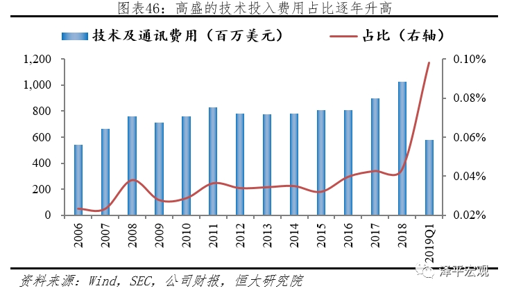高水准、高规格的科技投入,让高盛在未来的金融科技竞争中占据领先地位。一是人才结构和费用支出:2016年,高盛校园招聘员工中,有37%是科技、数理相关的专业人才,2017年这个比例上升到46%,整个高盛团队中科技人才规模占比达四分之一,超过Facebook等硅谷上市的科技公司;2006-2018年间,高盛在通讯和科技方面的费用是各项费用中唯一一项逐年升高的,年均增长率为5.73%,2018年技术及通讯费用投入10.23亿美元,同比增长14%。