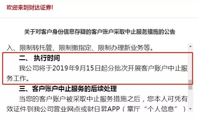 由于各家券商开展该项核查工作的进度不一,截止日期也有早晚。例如,财达证券已经于9月15日起分批次开展了客户账户中止服务工作。