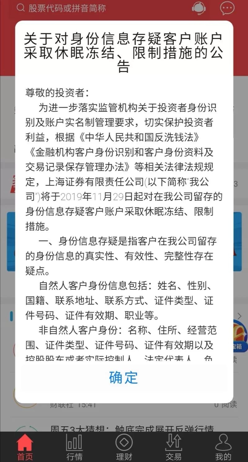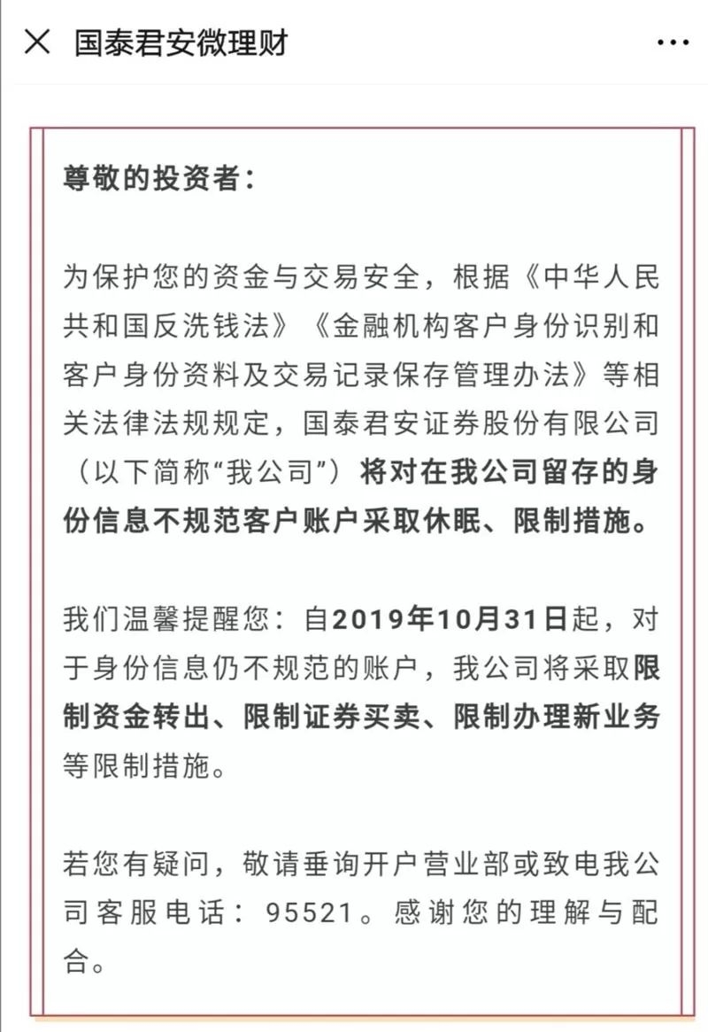 近日,国泰君安微理财公众号发布一则提示:自2019年10月31日起,对于身份信息仍不规范的账户,公司将采取限制资金转出、限制证券买卖、限制办理新业务等限制措施。