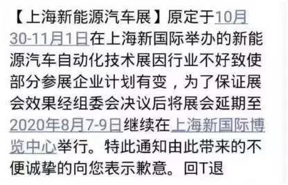 近日有一张截图在网络流传,截图称“原定于(2019年)10月30日至11月1日在上海新国际举办的上海新能源汽车自动化技术展,因行业不好致使部分车企计划有变,为了保证展会效果将会延期至2020年8月7日至9日继续在上海新国际博览中心举行。”