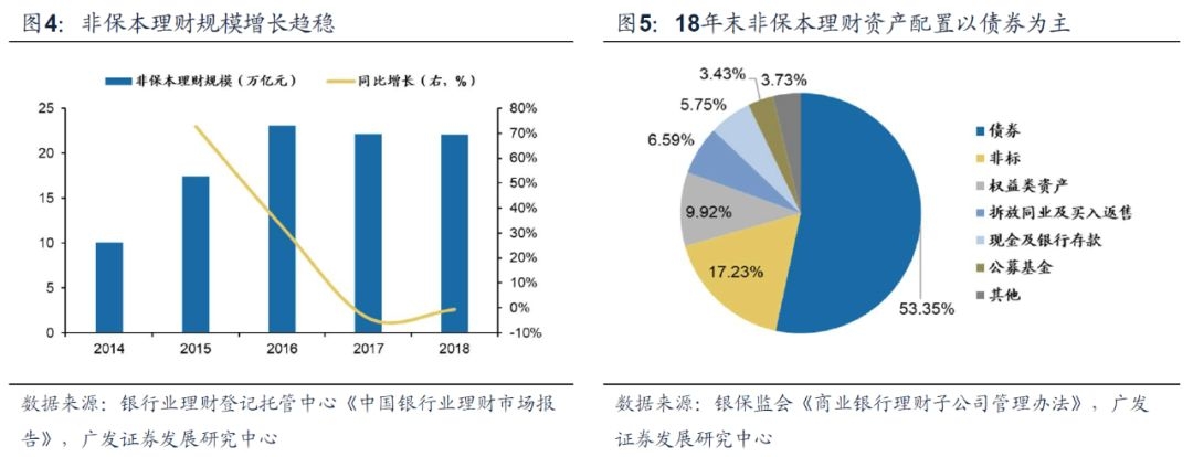初期以固收类投资为主,全牌照优势开拓大类资产配置,未来权益类资产比重逐渐提升:1)非保本理财余额总体保持平稳,但结构上仍以债券资产配置为主,18年占比达53%,较17年末全口径理财余额上升11%,但现金及存款占比较17年全口径下降8%;2)从理财子公司新发产品来看,根据新华网,工银理财发布的5款公募产品中有3款为固收类产品(固收类资产投资比例为在80-100%之间),其余2款混合类产品固收投资比例也在0-79%之间。