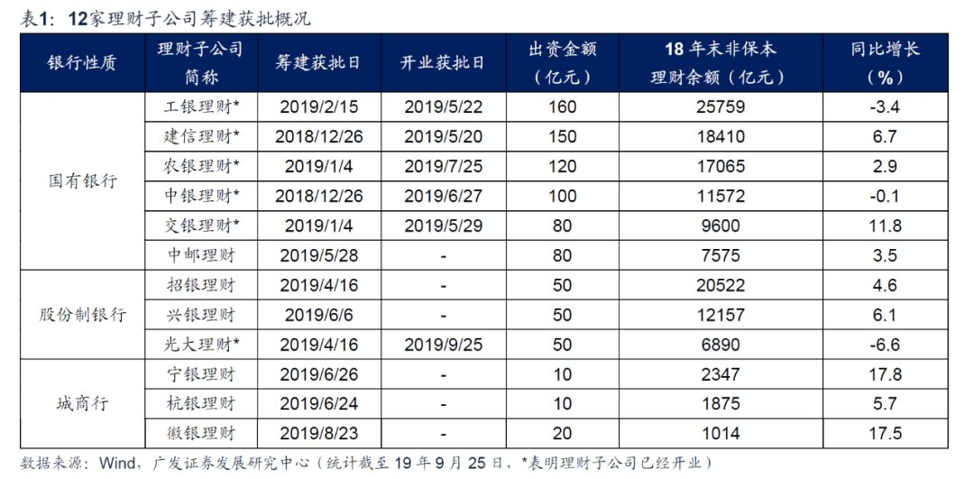 18年4月《关于规范金融机构资产管理业务的指导意见》(后文简称《资管新规》)、18年12月《商业银行理财子公司管理办法》(后文简称《管理办法》)相继出台,资管行业监管标准趋于统一。19年是银行理财子公司“元年”,在20年底“过渡期”前,筹备与开业将迈入加速期:1)根据公司公告,目前已有约33家银行成立理财子公司,其中工农中建交五大国有行、光大(首家股份行)理财子公司共6家已经顺利开业,还有6家已筹建获批;2)从分布结构来看,国有六大行凭借雄厚资本实力一马当先,设立理财子公司拟注册资本均在80亿元以上,多数股份制银行积极跟进,而地方银行步调差异明显,主要以资产规模较大的城商行为主。