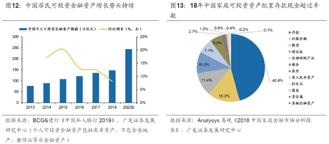 居民财富积累已成为推动资产管理行业发展的主要源动力:1)从总量来看,根据BCG测算,中国居民总财富增长势头持续,18年居民可投资金融资产总额达147万亿元,预计到23年有望达到243万亿元,年复合增长率达11%;2)从结构来看,根据Analysys易观,18年中国家庭金融资产配置中存款现金占比达51%,当前投资需求更偏向于收益稳健。随着未来居民金融资产配置需求多元化,在刚兑破除预期下,理财子公司将在引导居民形成正确财富管理观念发挥更加重要的作用。