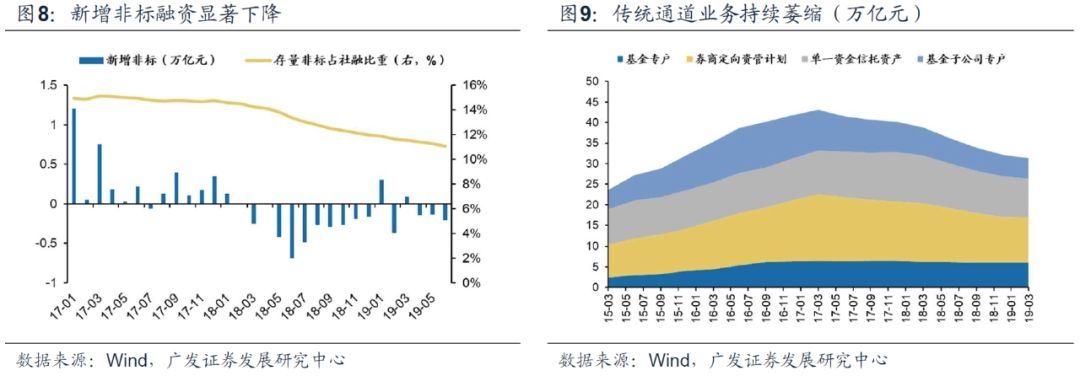 《资管新规》对限制期限错配、打破刚性兑付、禁止资金池操作均提出了更高的要求,目前初见成效:18年5月以来新增非标融资显著下降,基金、券商、信托等通道业务持续萎缩。设立银行理财子公司,不仅能推动银行理财回归代理人本质,实现风险和收益“买者自负”,还能与银行法人实现有效破产隔离,从根本上切断了风险从表外向表内传播的路径。