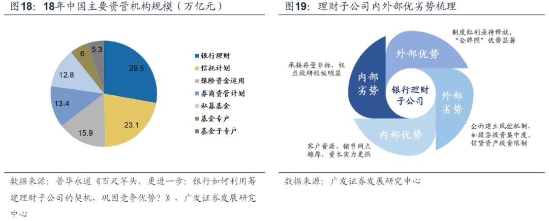 内部优势:理财子公司意在承接银行体内理财业务,银行股东综合优势较强:1)理财子公司可以依托母行雄厚的客户资源和销售网点,在客户、资产来源上具有绝对优势,形成一定品牌效应;2)理财子公司最低注册资本为10亿元人民币,相比其他资管子行业而言资本实力更强。内部劣势:由于《资管新规》过渡期截至2020年底,理财子公司设立初期仍需要发行期限匹配的理财产品,帮助对接、消化存量非标。与此同时,虽然理财子公司在非标与固收类投资方面具备经验与相对优势,但考虑到团队配备与激励机制缺失,短期内权益类投研能力难以迅速提高。