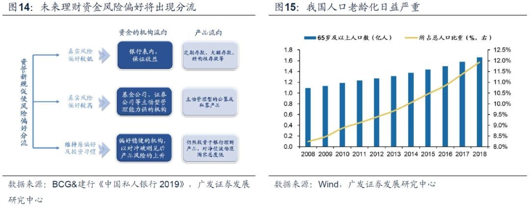 与此同时,我国社会老龄化加速,18年65岁及以上人口总数突破1.6亿,占比达11.9%。日益增长的居民养老需求难以由基本养老保险全部承载,居民个人的养老金融需求和养老第二、第三支柱的快速发展都将成为理财子公司的重大机遇:1)根据澎湃新闻,我国养老保险第三支柱拟考虑采取账户制,符合规定的银行理财、商业养老保险、基金等金融产品均可以成为第三支柱产品;2)根据人民网,中银理财已率先推出“稳富——福、禄、寿、禧”养老系列产品,聚焦养老客群提供长期投资、策略稳健的理财服务。