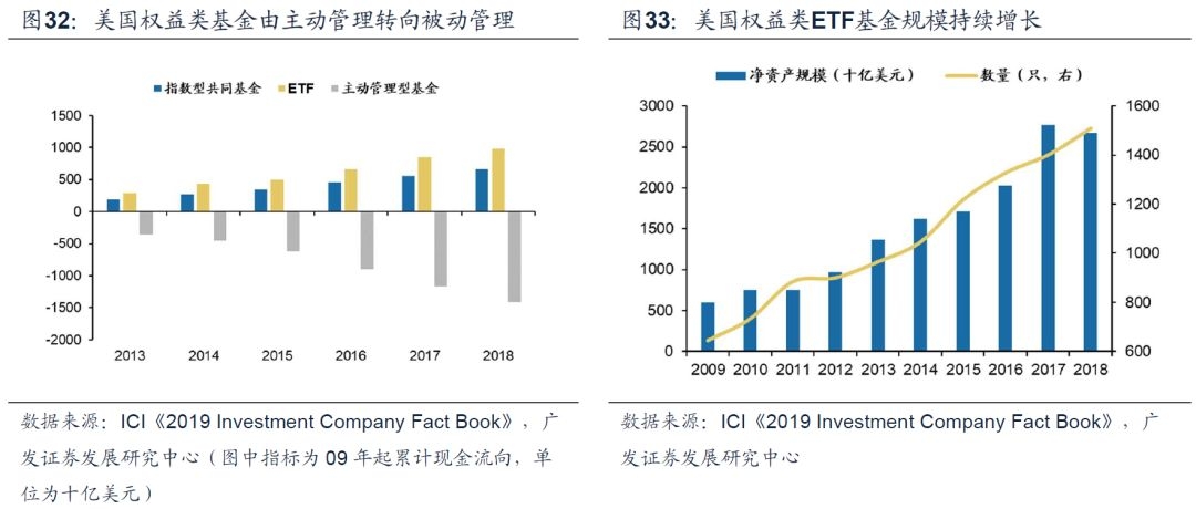 参考美国市场发展经验,随着养老金体系改革深入推进,DC计划与IRAs资产通过投资共同基金入市,市场主导权逐渐转向机构投资者,市场有效性显著提升,主动管理型基金难以获得超额收益。根据ICI统计显示,18年美国主动管理型基金资金累计净流出额达1.4万亿美元,主要流向更低费率的指数型基金,18年权益类ETF基金规模已突破2.6万亿美元。随着养老金、外资、理财子公司等长线资金加速入市,未来A股市场有效性将显著提升,A股或将进入指数化投资新时代。