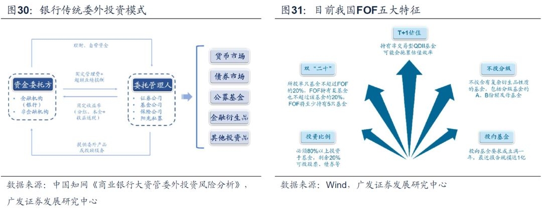 根据《商业银行理财业务监督管理办法》,商业银行理财产品不得简单作为资产管理产品的资金募集通道,更强调了银行理财产品自身的投资管理职责,我们认为以FOF/MOM为代表的主动委外投资模式或成主流:1)政策导向:《资管新规》允许公募基金作为理财产品配置的的底层资产,有助于推动银行理财产品净值化发展;2)投资风格:FOF和MOM产品兼具风险分散和收益稳定等多重优势,促进理财子公司落实大类资产配置;3)市场空间:我国FOF发展尚处起步阶段,按照发达国家FOF占共同基金规模10%左右测算,未来我国FOF产品规模有望达万亿。