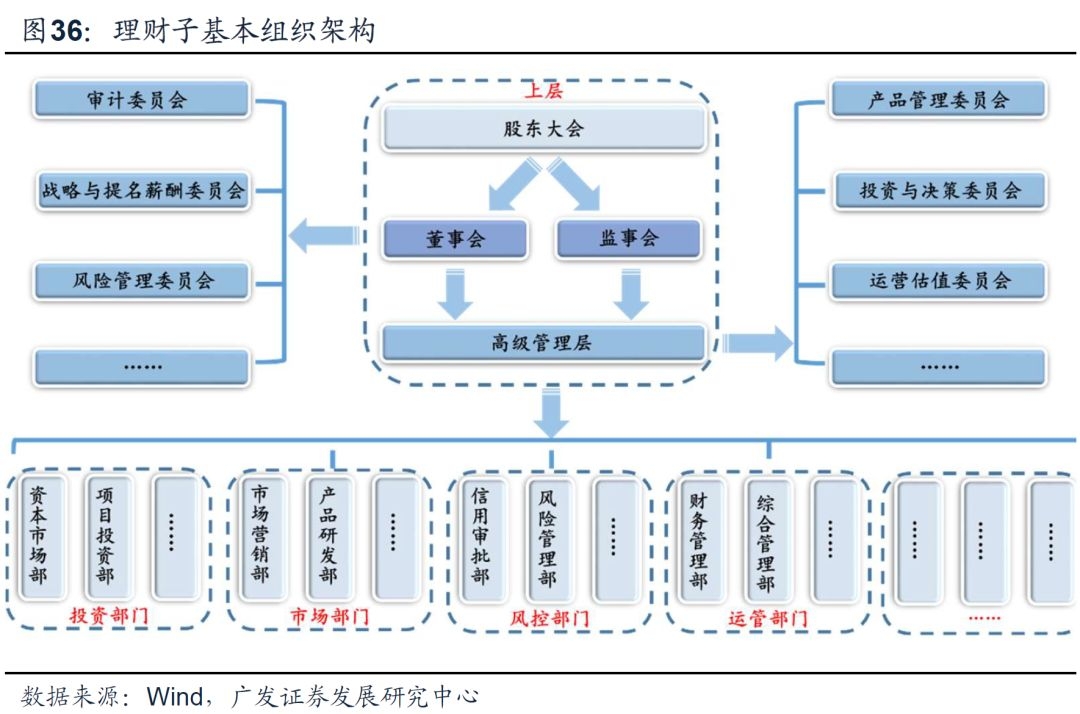 目前已开业的银行理财子公司组织架构基本形式主要为“上层-委员会-部门组织”三层架构:1)上层:股东大会、董事会和监事会、高级管理层(或经营管理层)三个梯度职责分工,管理人员通常包含一名总经理和若干名副总经理,通常副总经理的分工安排以投资研究、市场营销和运营管理为区分。2)委员会:董事会下设,以审核业务总体战略、监督职能为主。3)部门组织:管理层下设,一般包含投资、市场、风控、运营等部门。不同理财子可根据自身运营特点与要求设立相似和不同的委员会和部门组织。