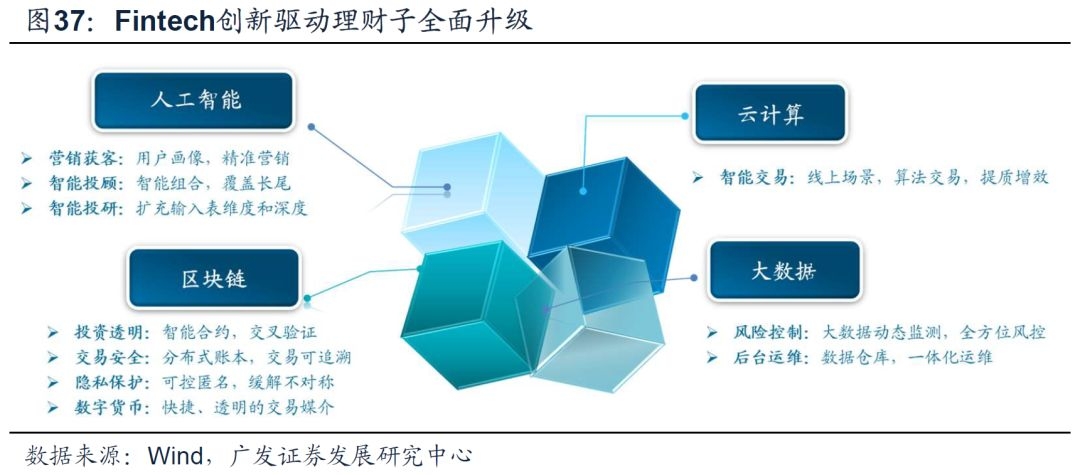 借母行科技支撑,驱动金融创新。理财子全流程系统性升级的需求将驱动Fintech创新:1)智能营销:线上销售渠道拓宽,利用AI用户画像,实现精准营销,降低获客成本;2)智能投顾:理财机器人智能划分风险偏好层级并构建组合,实现产品灵活,覆盖长尾客户;3)智能投研:借助深度学习、自然语言处理、网络爬虫等,扩充信息维度与深度,提高研究质量和决策效率;结合区块链技术,智能合约交叉验证,提高投资端交易公平透明度;4)智能风控:净值化管理转型,大数据动态监测全流程风险,如贝莱德投资风控平台阿拉丁(Aladdin);5)信息与交易安全:未来基于区块链的数字货币为交易媒介,分布式账本,交易可追溯,有效控制道德风险;可控匿名性,保障隐私,有利于提升客户输入信息真实性,缓解信息不对称。