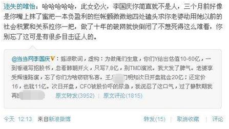 2011年,当当网上市后,李国庆在微博上和投行摩根士丹利女职员,也就是“大摩女”掀起了骂战。李国庆指责摩根士丹利、瑞信这两家负责当当网赴美上市的投行曾存在压低估值等不规范行为,导致当当上市后收益不理想,还自创了一段“摇滚歌词”大骂投行。