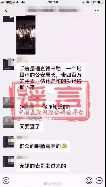 谣言2:10日晚8时许,在救援工作正紧张进行时,网上流传出一张事故救援现场的微信截图,并附有“手表是理查德米勒”、“一个地级市的公安局长,带四百万的手表,估计是忙的没记得摘下来”等谣言。