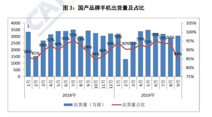 另外,从国内手机市场国内外品牌来看,2019年9月,国产品牌手机出货量3060.9万部,同比下降11.2%,占同期手机出货量的84.5%;上市新机型80款,同比下降2.4%,占同期手机上市新机型数量的88.9%。2019年1-9月,国产品牌手机出货量2.64亿部,同比下降4.2%,占同期手机出货量的91.8%;上市新机型384款,同比下降33.9%,占同期手机上市新机型数量的88.7%。