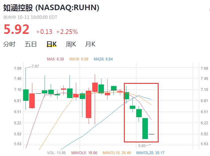 每日经济新闻(微信号:nbdnews)记者注意到,本周如涵控股曾连续4个交易日下跌,其中周四收跌9.11%,不过,周五如涵控股收涨2.25%,小幅回血,目前总市值4.9亿美元。