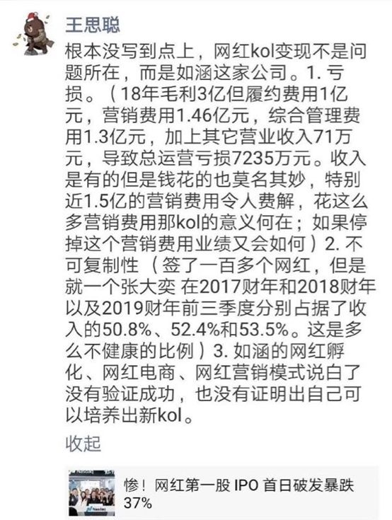 如涵上市不到一周后,王思聪也在朋友圈分析了如涵的业务模式。他称如涵所存在的三大问题包括:首先是因营销费用占比过高等所造成的亏损;其次则是网红具有不可复制性;最重要的是如涵的模式“说白了没有验证成功,也没有证明出自己可以培养出新KOL”。