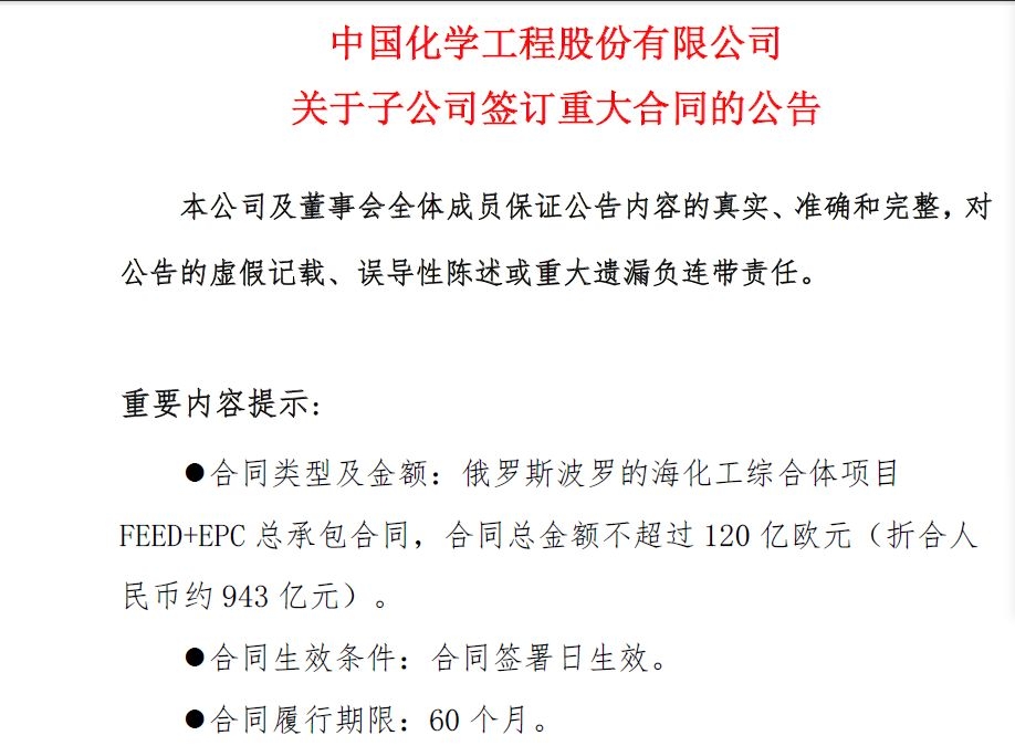 董事会已研究并通过千亿合同事项10月13日晚间公告显示,中国化学(601117)全资子公司中国化学工程第七建设有限公司(以下简称“七公司”)与波罗的海化工联合有限责任公司,签署了俄罗斯波罗的海化工综合体项目FEED+EPC总承包合同,合同总金额不超过120亿欧元(折合人民币约943亿元)。