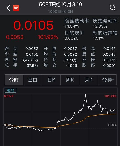 对于市场上涨的预期及反应,在高杠杆的上证50ETF期权有非常激烈地表现。上周五其中一个看涨期权更是大涨102%,盘中更一度大涨182%。