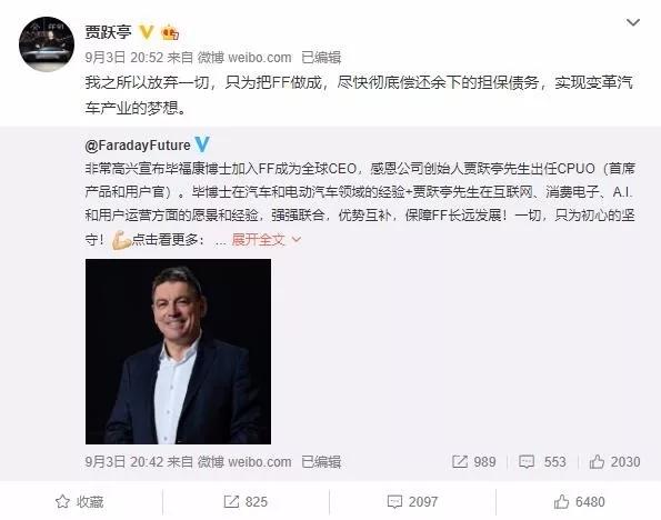 他最新一条微博停留在9月3日,“我之所以放弃一切,只为把FF做成,尽快彻底偿还余下的担保债务,实现变革汽车产业的梦想。”那天他卸任FF的CEO职位,出任CPUO(首席产品和用户官)。