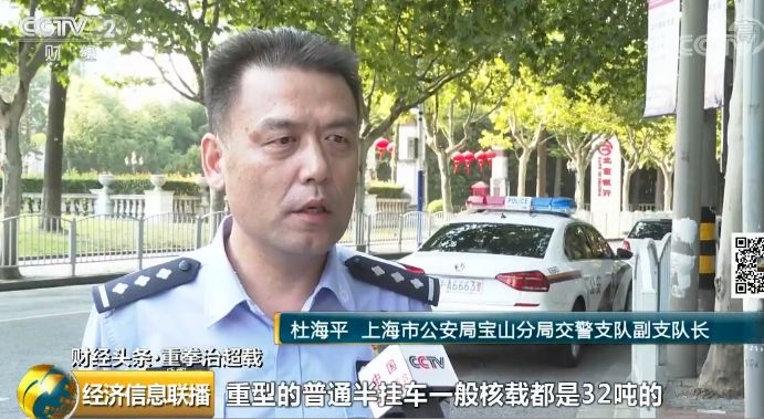 上海市公安局宝山分局交警支队副支队长 杜海平:重型的普通半挂车一般核载都是32吨的,凭我们经验,一般看到这样的车子装的货物应该是超载的,民警拦下来以后发现这辆车子没有超载,因为它的核载是48吨。