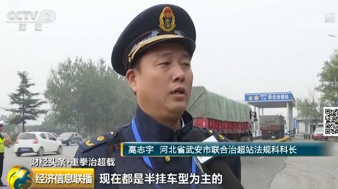 河北省武安市联合治超站法规科科长 高志宇:现在都是半挂车型为主的,三轴以上的,这些超限车辆现在还有,拉钢材、石料、还有水泥等。经检测它如果是超限车辆,会登记下来先卸载,卸载完以后这些货物允许他们分装运回。