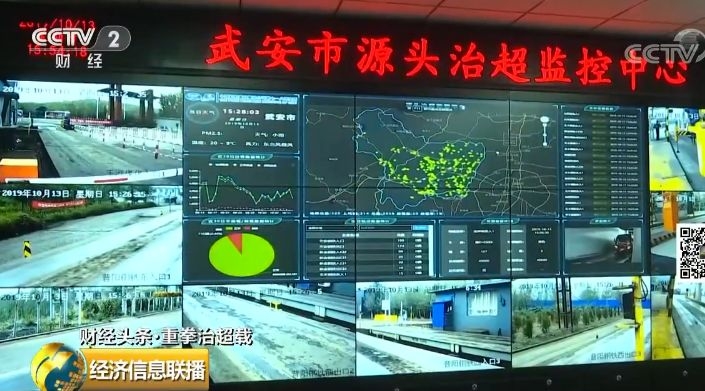 记者在河北邯郸武安市的一家钢铁公司内看到,装载完货物的货车在出厂时都要经过称重,符合载重规格的才能放行出厂。与这家企业共享这些信息的是河北武安市源头治超监控中心。每一台装载完的车辆在过泵时候,它的信息就会直接上传到监控中心。